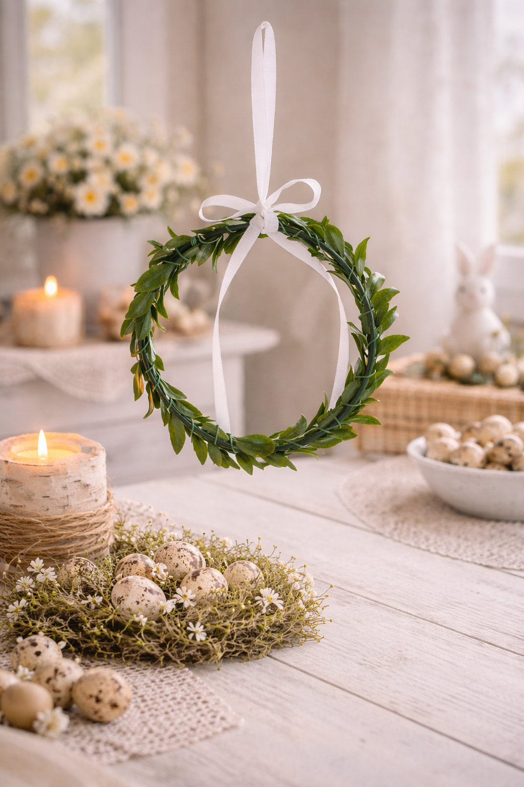 Geschenkidee: Deco Anhänger Shabby Chic Kranz mit weißer Schleife. Material: Kunstblume | Durchmesser: ca. 10 cm, Farbe: grün