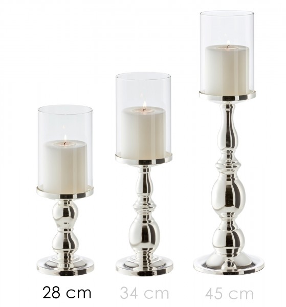 ✔ KLASSISCHES, ZEITLOSES DESIGN: Dasd Windlicht Mascha besticht im Design durch den geschwungenen Sockel aus versilbertem Metall und den hohen Glasaufsatz. Es ist in den drei Höhen 28 cm, 34 cm und 45 cm erhältlich. Es lassen sich wunderbar Windlichter in zwei oder allen drei Höhen miteinander kombinieren.